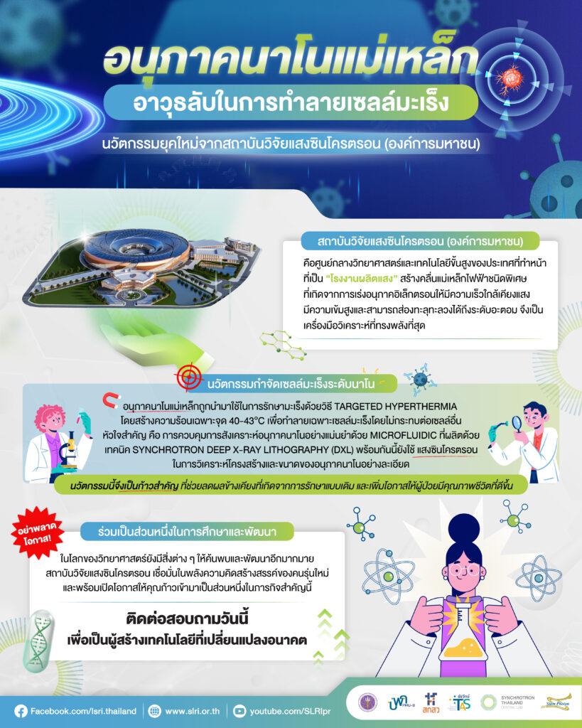 อนุภาคนาโนแม่เหล็กถูกนำมาใช้ในการรักษามะเร็งด้วยวิธี TARGETED HYPERTHERMIA โดยสร้างความร้อนเฉพาะจุด 40-43°C เพื่อทำลายเฉพาะเซลล์มะเร็งโดยไม่กระทบต่อเซลล์อื่น หัวใจสำคัญ คือ การควบคุมการสังเคราะห์อนุภาคนาโนอย่างแม่นยำด้วย microfluidic ที่ผลิตด้วยเทคนิค Synchrotron Deep X-ray Lithography (DXL) พร้อมกันนี้ยังใช้ แสงซินโครตรอน ในการวิเคราะห์โครงสร้างและขนาดของอนุภาคนาโนอย่างละเอียด
