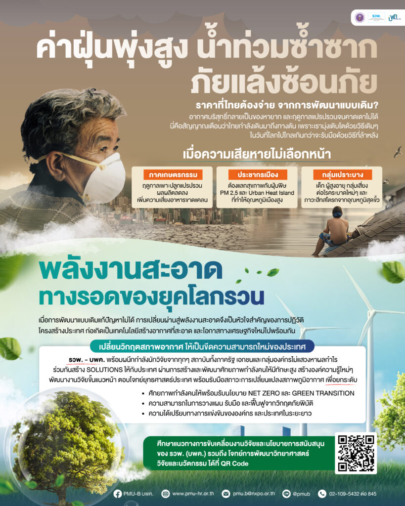 รวพ. – บพค. พร้อมผนึกกำลังนักวิจัยจากทุกๆ สถาบันทั้งภาครัฐ เอกชนและกลุ่มองค์กรไม่แสวงหาผลกำไร ร่วมกันสร้าง Solutions ให้กับประเทศ ผ่านการสร้างและพัฒนาศักยภาพกำลังคนให้มีทักษะสูง สร้างองค์ความรู้ใหม่ๆ พัฒนางานวิจัยขั้นแนวหน้า ตอบโจทย์ยุทธศาสตร์ประเทศ พร้อมรับมือสภาวะการเปลี่ยนแปลงสภาพภูมิอากาศ เพื่อยกระดับ 👇